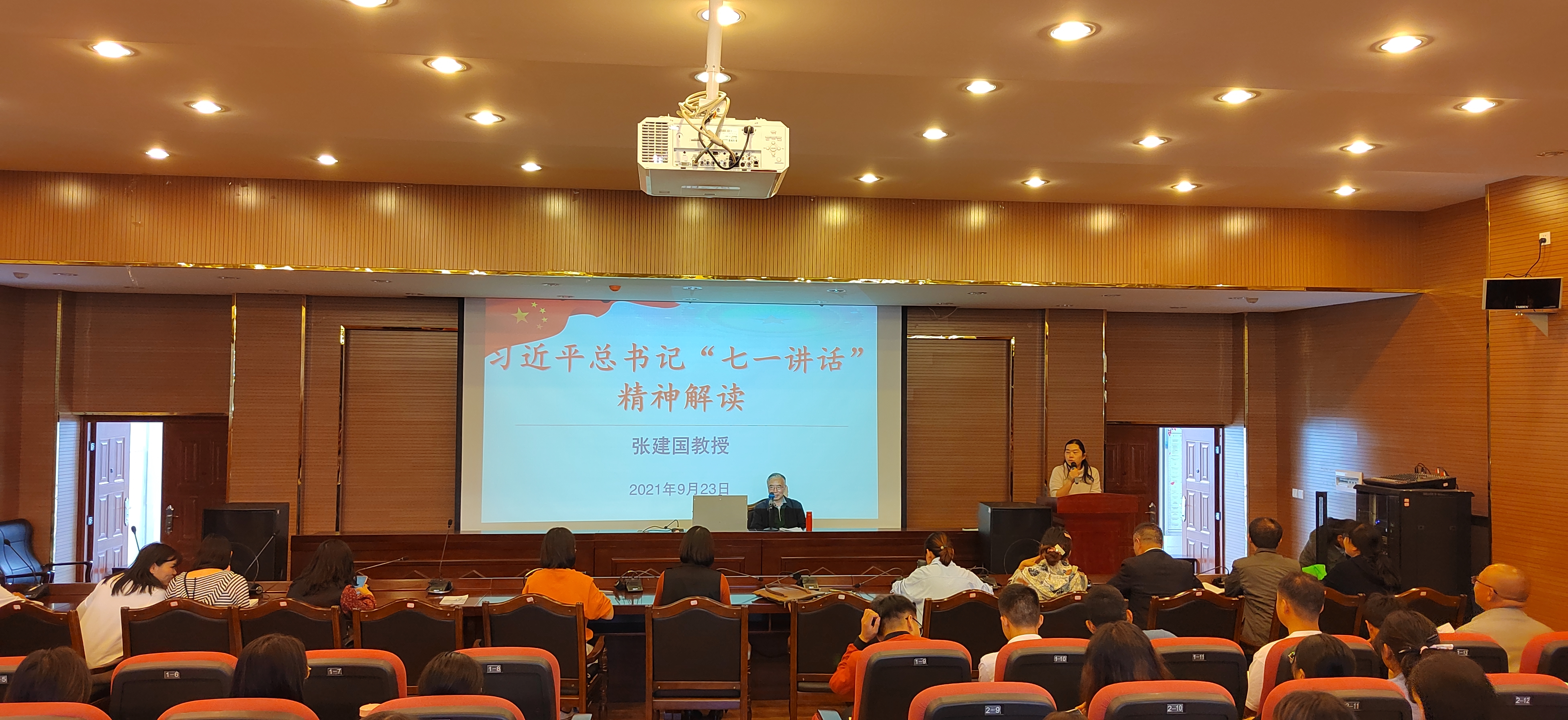 2021年9月23日下午,马克思主义学院邀请马工程首席专家、云南民族大学教授张建国做习近平总书记“七一”重要讲话精神进行专题宣讲。马克思主义学院全体思想政治理论课教师,学院2019级思想政治教育专业学生到场聆听。