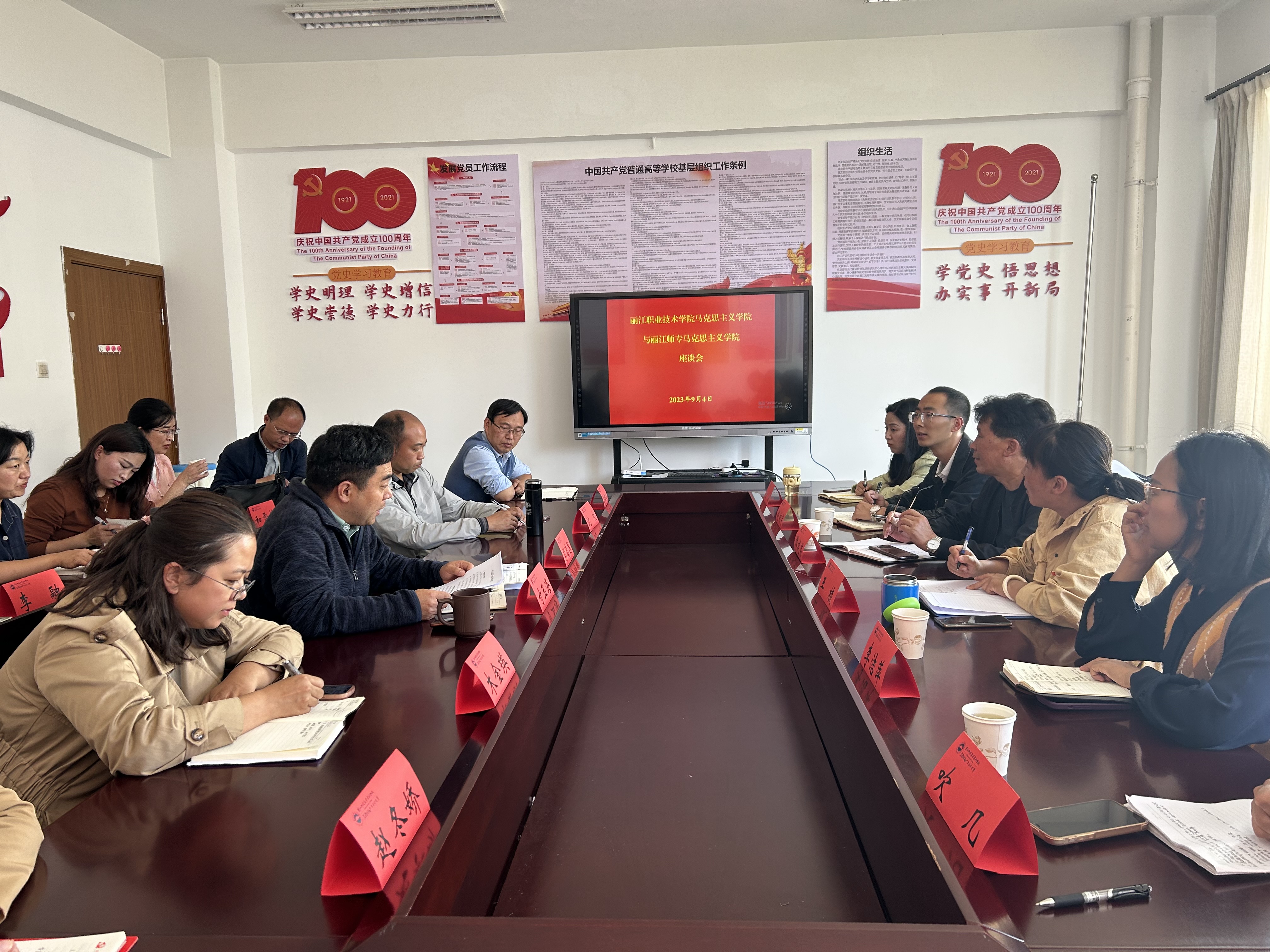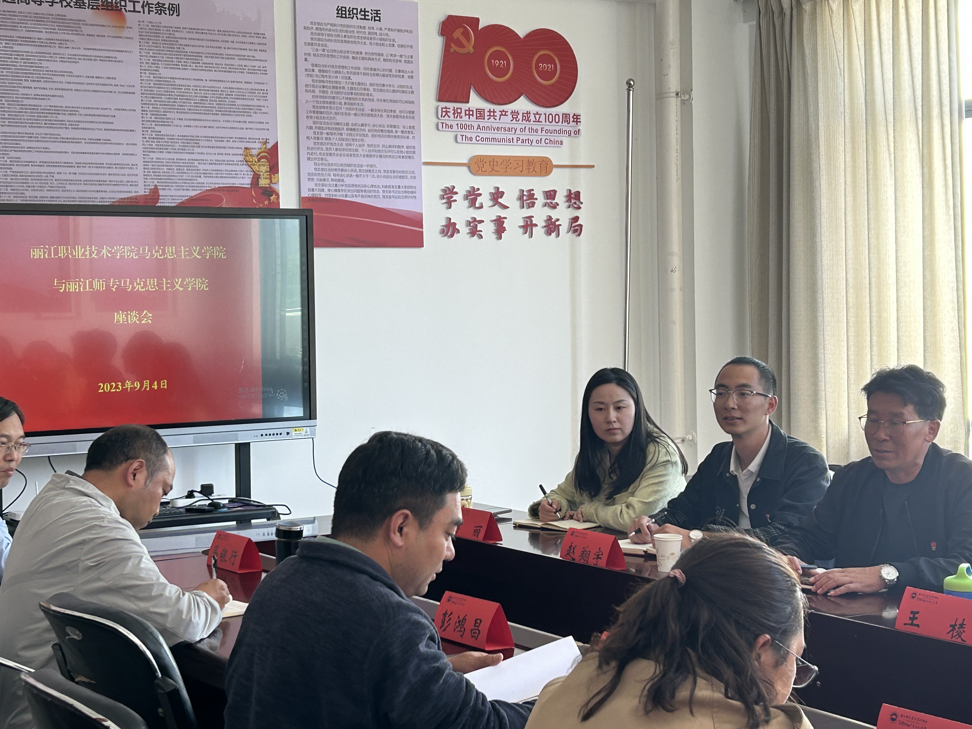 2023年9月4日下午,丽江职业技术学院副校长谭建荣、马克思主义学院负责人赵翔宇、思想政治理论课教师王棱、杨丽、李洁萍、格桑吹几一行六人到马克思主义学院考察交流,并召开座谈会。学校党委副书记彭鸿昌以及马克思主义学院全体坐班人员和教研室主任参加了座谈会。座谈会由寸玉海副院长主持。