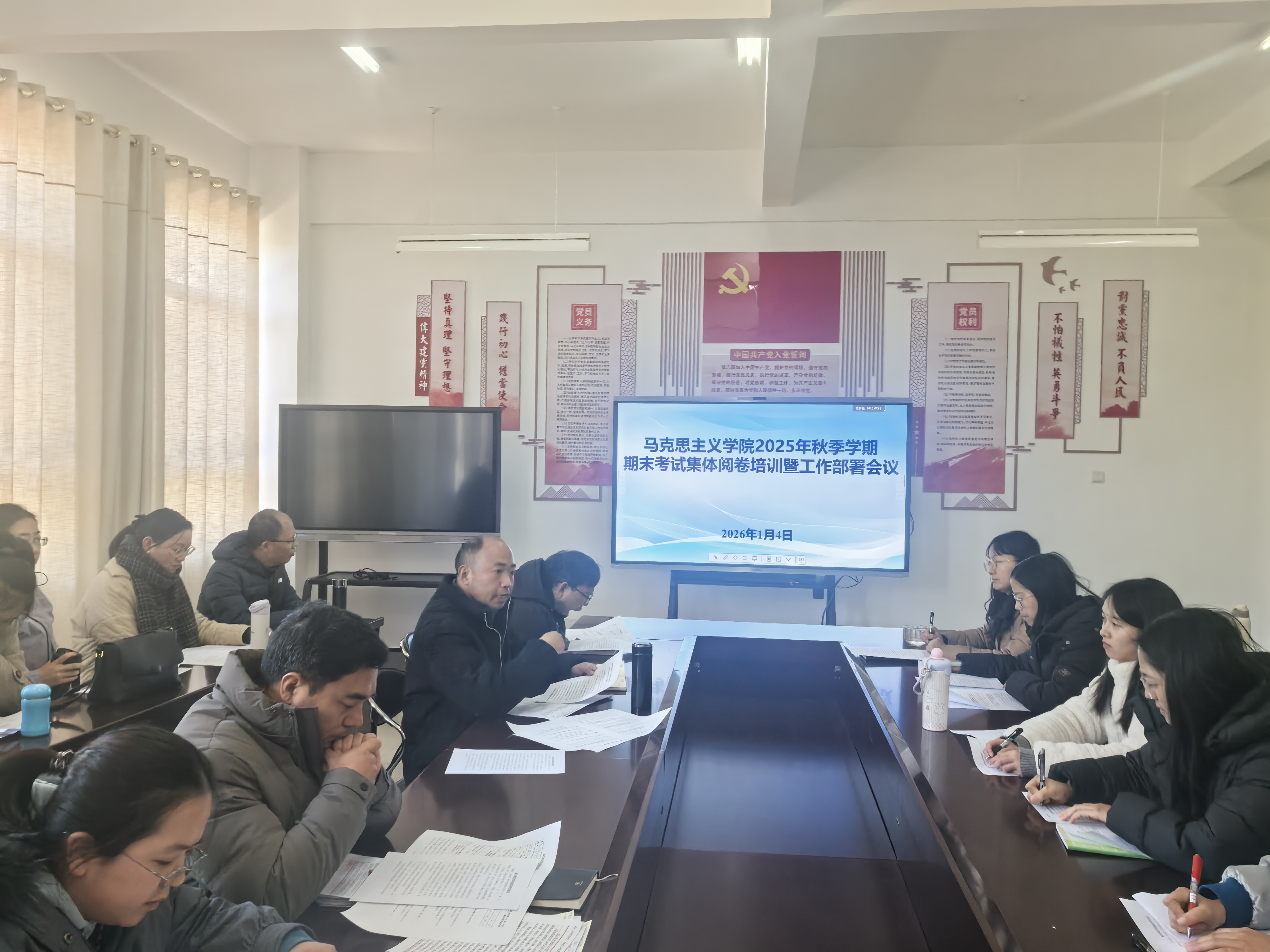 根据本科教学工作合格评估的相关工作要求,我院于2026年1月4日在求是楼221会议室召开了2025年秋季学期期末考试集体阅卷培训暨工作部署会议。沈欢主持会议,马院全体教职工参加了会议。