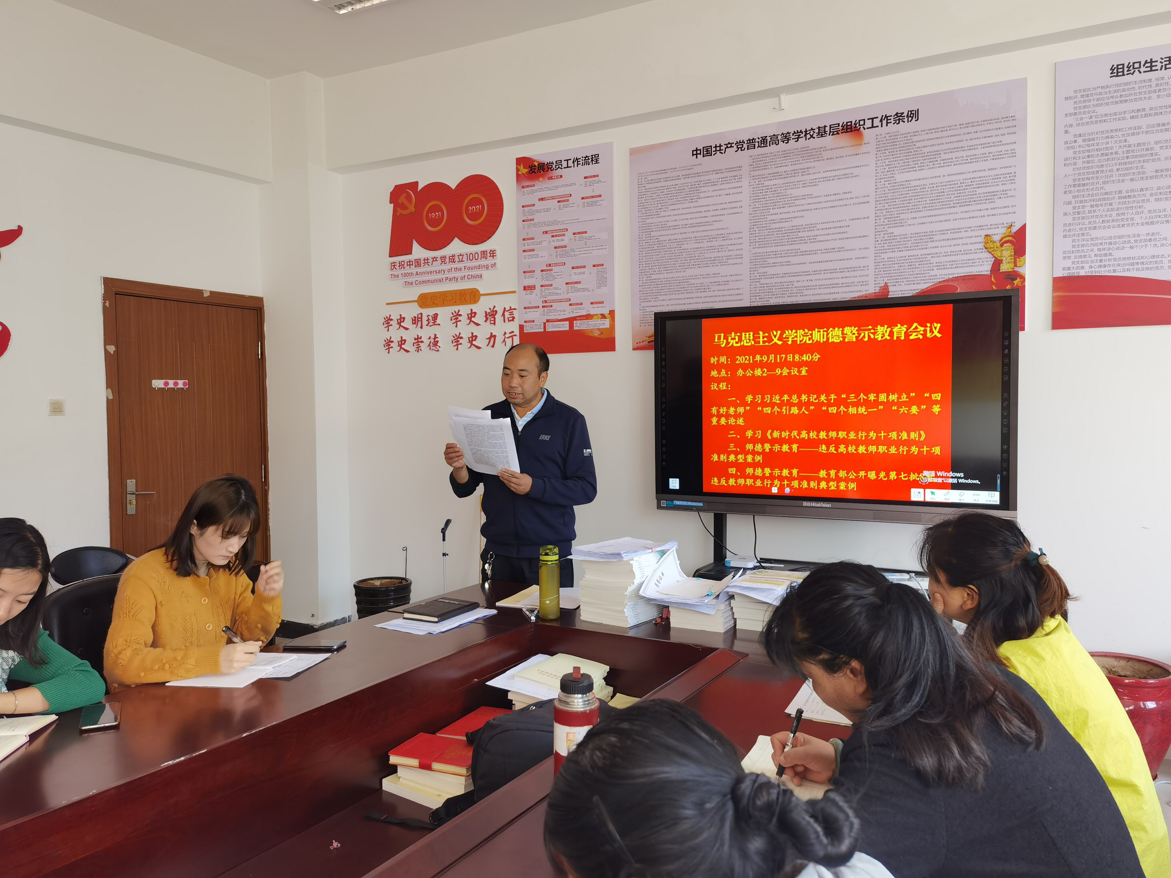 根据校党委印发的《丽江师范高等专科学校师德专题教育实施方案》( 丽师发〔2021〕14号)文件要求,我院于2021年9月17日上午召开了师德专题教育会议,22名所属教职工参加了会议,党总支书记沈欢主持会议,主要开展了以下专题教育活动: