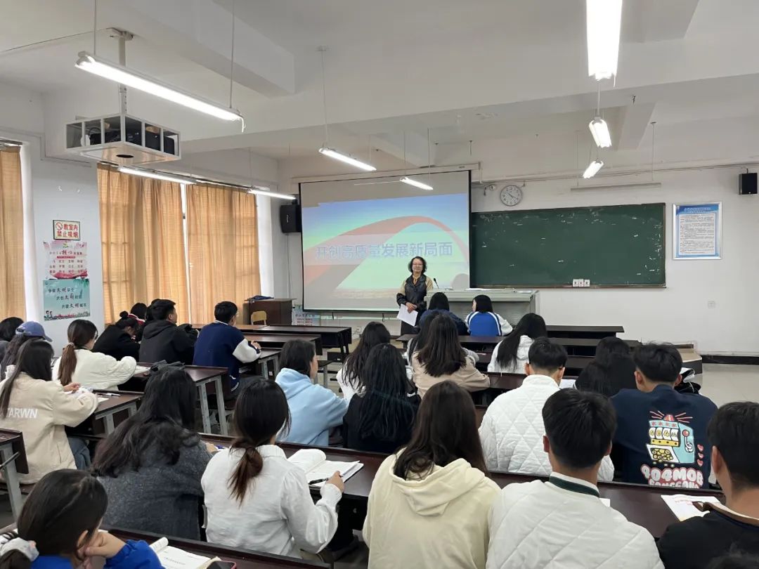 6月13日,副校长张兰胜从新时代中国经济的基本特征是由高速增长阶段转向高质量发展阶段,结合新时代10年的伟大变革,教育学生深刻把握时代脉搏、牢记历史使命。