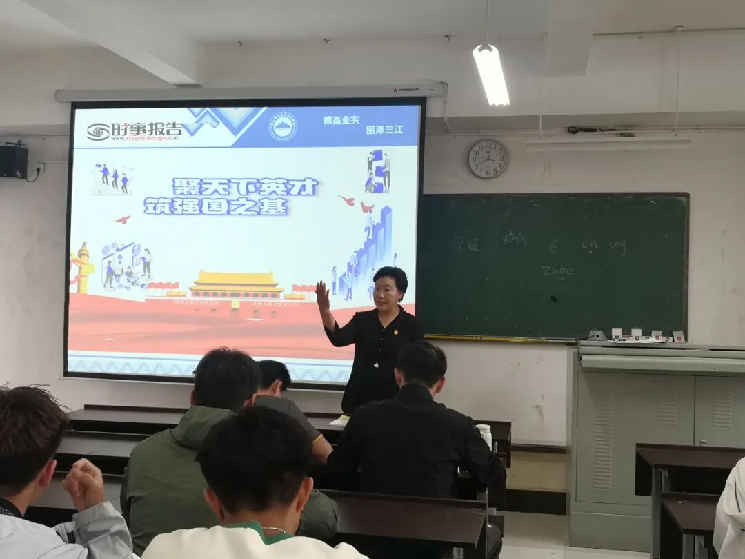 形势与政策”课是理论武装时效性、释疑解惑针对性、教育引导综合性都很强的一门高校思想政治理论课,是帮助大学生正确认识新时代国内外形势,深刻领会党的二十大精神的核心课程,是第一时间推动党的理论创新成果进教材进课堂进学生头脑,引导大学生准确理解党的基本理论、基本路线、基本方略的重要渠道。为深入学习贯彻党的二十大精神,深入贯彻落实习近平总书记关于加强和改进高校思想政治工作的重要论述和中共中央、国务院《关于加强和改进新形势下高校思想政治工作的意见》精神,及时、准确、深入地推动习近平新时代中国特色社会主义思想进教材进课堂进学生头脑,宣传党中央大政方针,牢固树立“四个意识”,坚定“四个自信”,培养担当民族复兴大任的时代新人。按照相关要求,我校领导带头上讲台,为学生讲授形势与政策课。