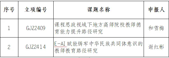 近日,收到云南省高校教师教育联盟 云南省教育科学规划领导小组办公室文件《关于公布2024年度云南省教育科学规划(高等学校教师教育联盟)教师教育专项课题立项课题名单的通知》,我院和雪梅老师申报的项目“课程思政视域下地方高师院校教师德育能力提升路径研究”获得立项。