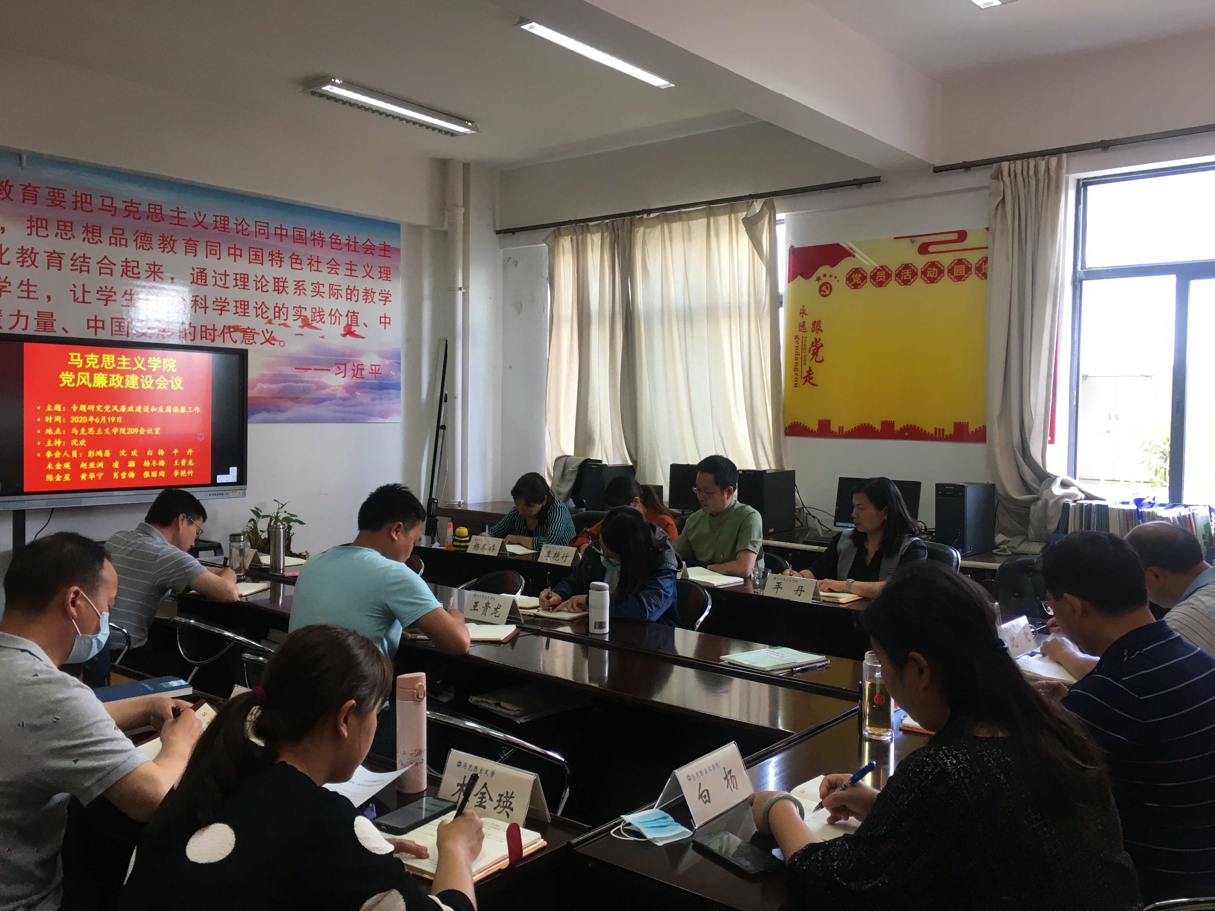 根据《2020年度丽江师范高等专科学校党风廉政建设责任书》的要求,马克思主义学院于2020年6月19日15:30分在办公楼209会议室召开党风廉政建设会议,专题研究党风廉政建设和反腐倡廉工作。校党委副书记彭鸿昌同志到会指导工作。马克思主义学院党总支支委委员沈欢、白杨、木金瑛、平丹、赵亚洲,教师党支部支委委员杨冬梅、陈金星、黄华宁,学生党支部支委委员王贵龙、张丽珣、肖雪梅,教学科长凌灏,兼职辅导员李艳竹等13名同志参加了会议。