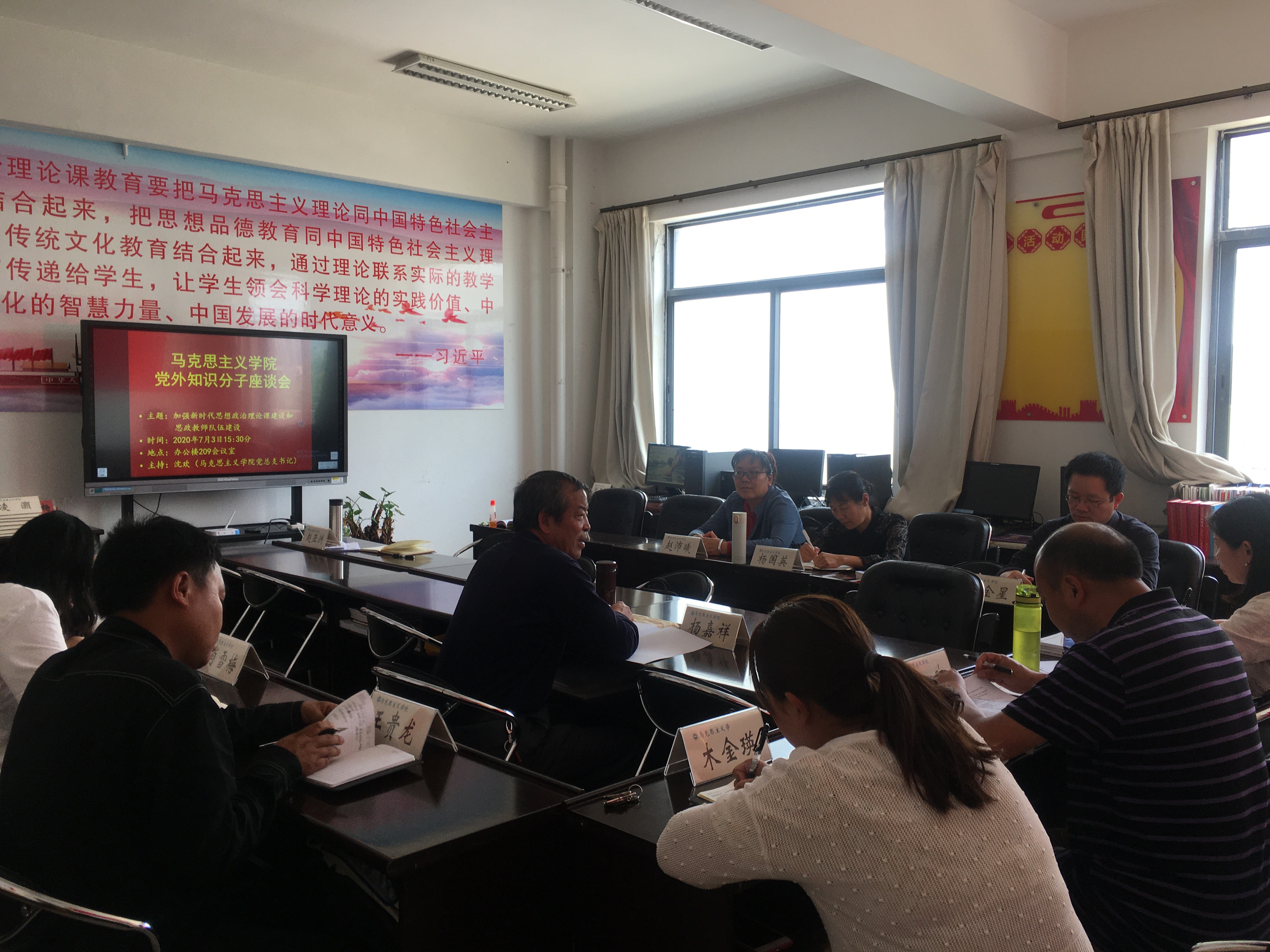 根据《中国共产党统一战线工作条例(试行)》、《中共丽江师范高等专科学校委员会意识形态工作责任制考核责任书》等文件要求,马克思主义学院党总支于2020年7月3日在办公楼209会议室召开了党外知识分子座谈会。党总支书记沈欢主持会议。马克思主义学院三位党外知识分子赵沛曦、杨国英、杨嘉祥应邀参加了会议。参加会议的还有党总支支委委员平丹、木金瑛、赵亚洲和两个党支部支委委员杨冬梅、王贵龙、陈金星、张丽珣、肖雪梅。