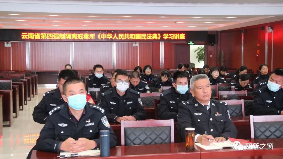 根据我院党总支与云南省第四强制隔离戒毒所签订的《党建结对共建合作协议》和双方协商的结对共建活动计划,2020年10月23日,我院选派寸玉海同志到云南省第四强制隔离戒毒所为警察职工开展民法典学习专题讲座。寸玉海同志围绕民法典的编撰、民法典实施的意义、民法典的体系及创新、民法典对司法行政部门的影响及要求等方面进行了深入浅出、全面详实的讲解,使警察职工进一步充分认识到《中华人民共和国民法典》是新中国成立以来第一部以“法典”命名的法律,这部历经几十年、凝聚几代人心血编纂的法典,被誉为“社会生活的百科全书”,与每个人的生活都息息相关;特别对近年来频繁出现的社会现象进行了规范,从而将更好的保护人民权益,切实提高广大人民群众的法律意识,共创法治中国。