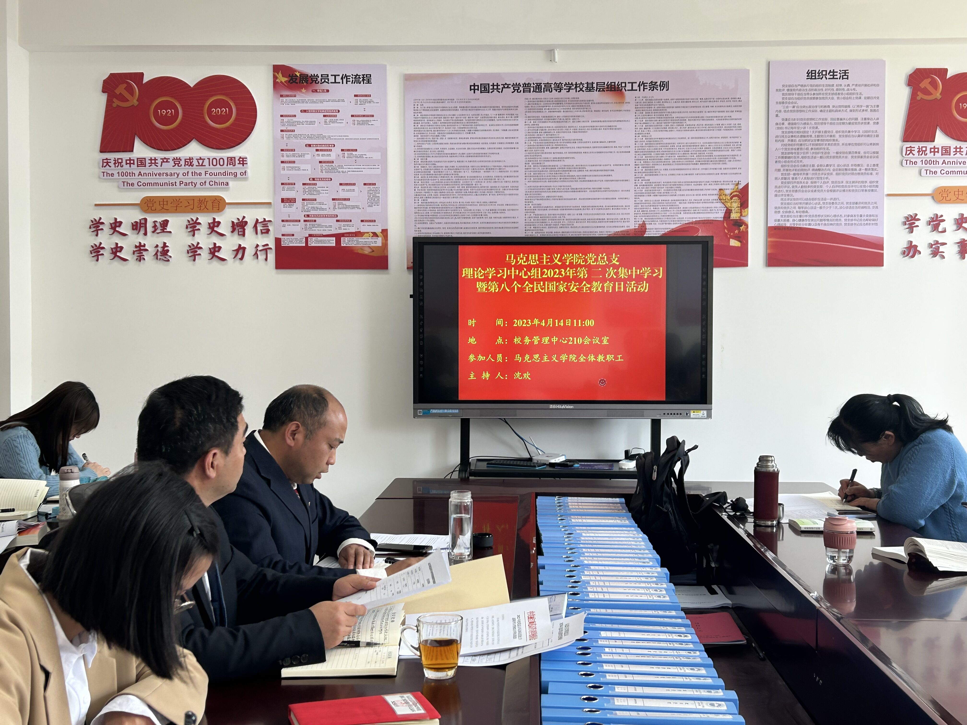 2023年4月14日,我院在校务管理中心210会议室开展了第八个全民国家安全教育日活动暨党总支理论学习中心组2023年第二次集中学习。党总支书记沈欢主持集中学习,学院全体教职工参加了集中学习活动。参会人员传达学习了《学习贯彻习近平新时代中国特色社会主义思想主题教育工作会议精神》《关于在全党大兴调查研究的工作方案》《习近平论坚持总体国家安全观(2023年)》《习近平关于网络强国论述摘编》《习近平论宣传思想工作(2023年)》《党的二十大报告辅导读本:推进国家安全体系和能力现代化,坚决维护国家安全和社会稳定》《党的二十大报告:建设具有强大凝聚力和引领力的社会主义意识形态》《宗教政策法规》等内容,通报了2022年度党总支书记沈欢抓基层党建工作述职评议考核综合评价反馈意见。
