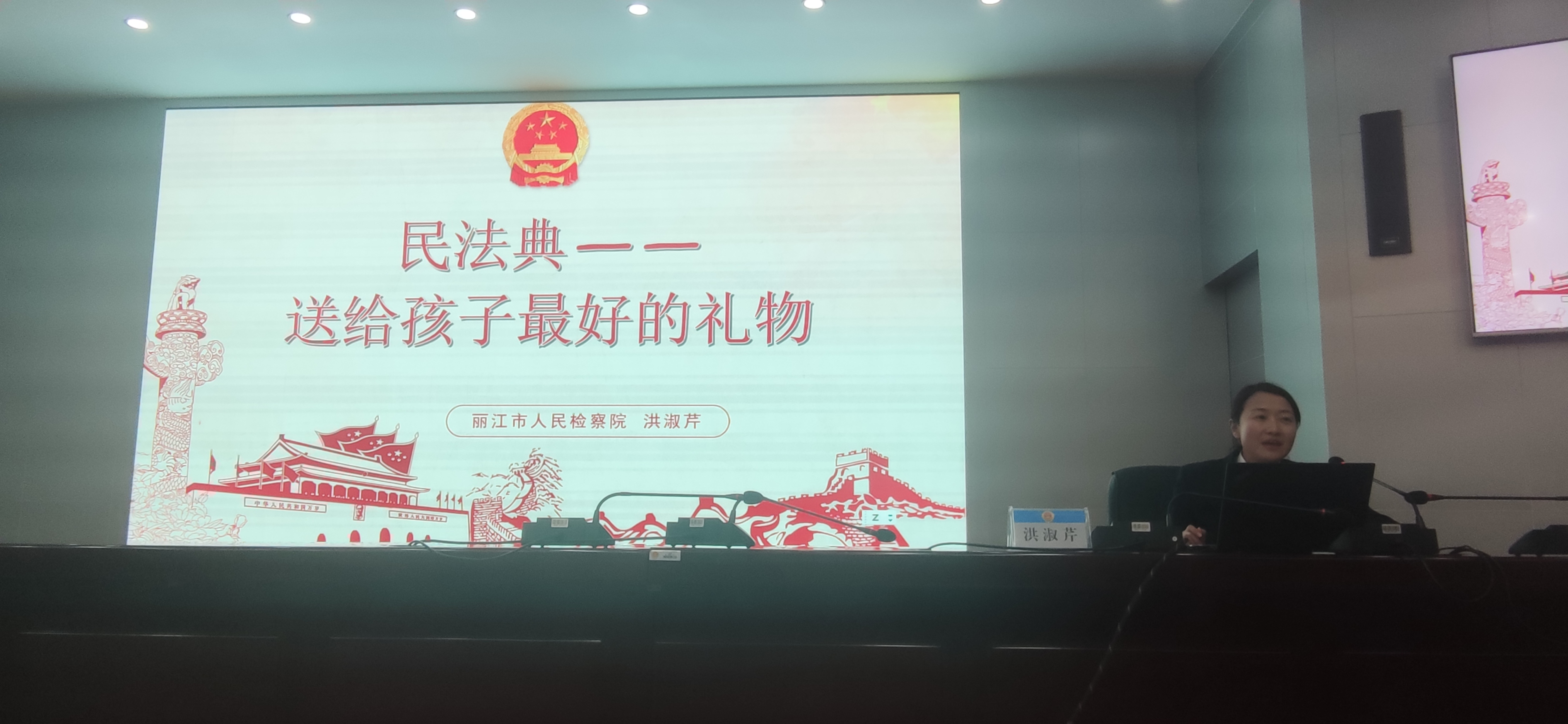 最后,市人民检察院洪淑芹检察官以《送给孩子最好的礼物》为主题讲述了宪法的基本内容、宪法与民法典的关系、民法典与生活等几个方面,以大量生动的案例、社会热点问题解读了《民法典》法条,为在座的师生上了一堂精彩的法治课。
