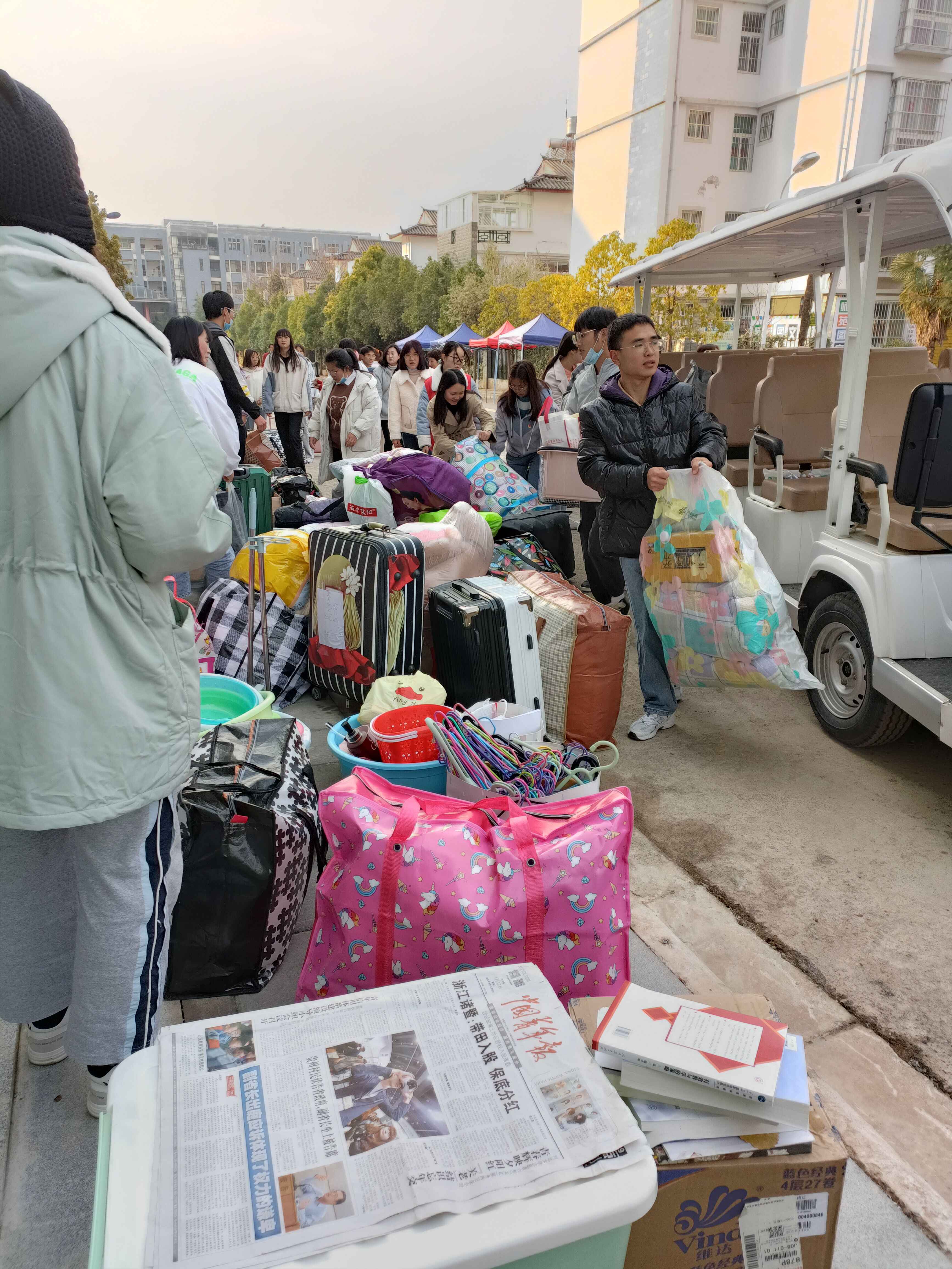 “天青色等烟雨,而我在等你。”3月7日早上七点的天气似乎在考验大家的耐力,虽然已入初春,丽江的早晨还是如此寒冷,寒风瑟瑟,但这毫不影响志愿者的服务热情,马克思主义学院的志愿者队伍早已在学校南门等候,志愿者们胸前佩戴团徽,面带微笑,整装待发,在丽师等待满载而归的2018级学子。学院领导也于7点前赶到学校双创中心大楼和四栋学生公寓,现场帮助返校的毕业生解决入住问题,安排行李搬运工作。