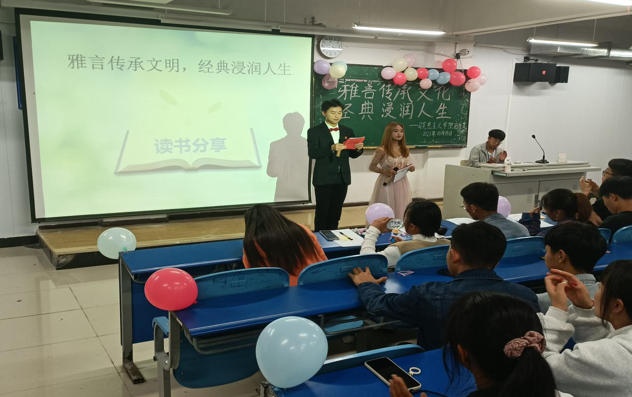 “读一本好书,就像交了一个益友”臧克家曾说过。书籍对于人类,就如水之于鱼;对于个人而言,读书可以陶冶情操;对于学习而言,可扩大知识范围。三更灯火五更鸣,正是男儿读书时,黑发不知勤学早,白发方悔读书迟。读书,使人精神升华,使人遇事淡定,使人视界拓宽。这是一种意境,一种境界,一种情调,一种人生财富。在这个世界上,易逝去的东西很多,能留下的永远只有知识,读书则是获取知识的重要途径。民族的强大需要更多的有识之士为之建言献策。高尔基说过,书是人类进步的阶梯。人生是一段不断向前的路,书籍则是这一条路的奠基石。特此马克思主义学院团总支于2021年10月15日19点举办了以“雅言传承文明,经典浸润人生”为主题的读书分享比赛,带领我们一起走进经典,与信仰对话、与人生对话,体会书中的道理,明白人生的真理,走出属于自己的华丽篇章。