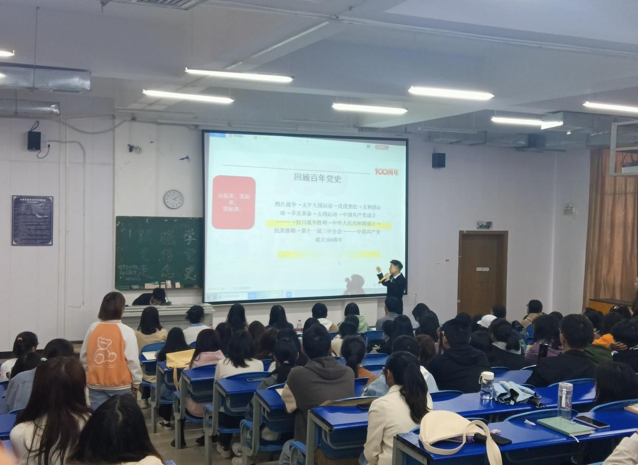 此次活动以宣讲的形式进行,主要由马克思主义学院学生党史宣讲团成员赵海同学进行宣讲,赵海向同学们讲述了我们党经历过北伐战争、土地革命战争、抗日战争、解放战争的艰苦卓绝的革命历程,推翻了“三座大山”,最终实现了民族独立和人民解放,人民当家作主,中国共产党带来全国各族人民站起来、富起来、强起来。此外,通过视频播放,向同学们展示了经过艰苦奋斗,我国已经进入新时代,现在已经实现了全面小康,开启了全面建设社会主义现代化强国的新征程。
