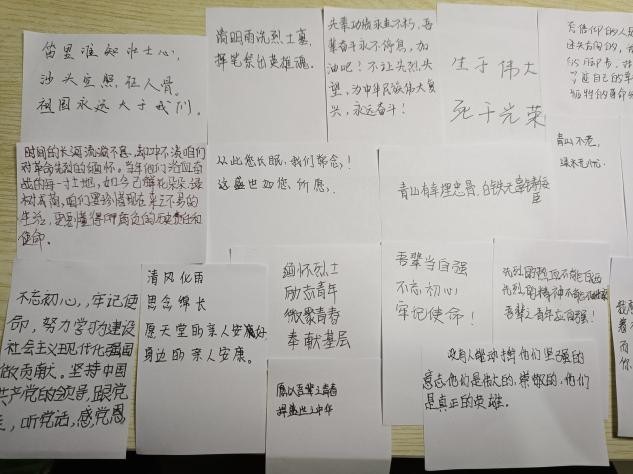 第三环节,对逝去的先烈和亲人说一句话写在便利贴上,同学们纷纷写下了自己对逝去的先烈和亲人想说的话,同学们用深情的话语表达对逝世亲人的思念,对先烈的缅怀。