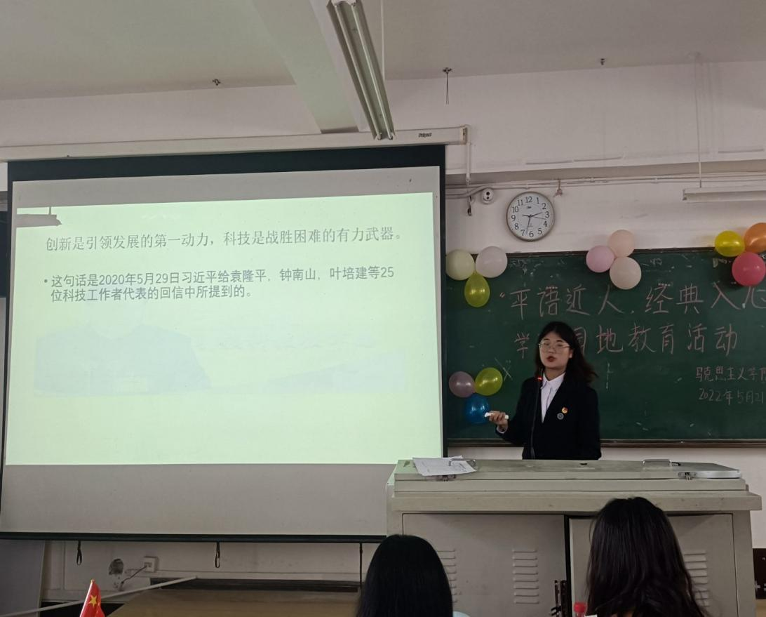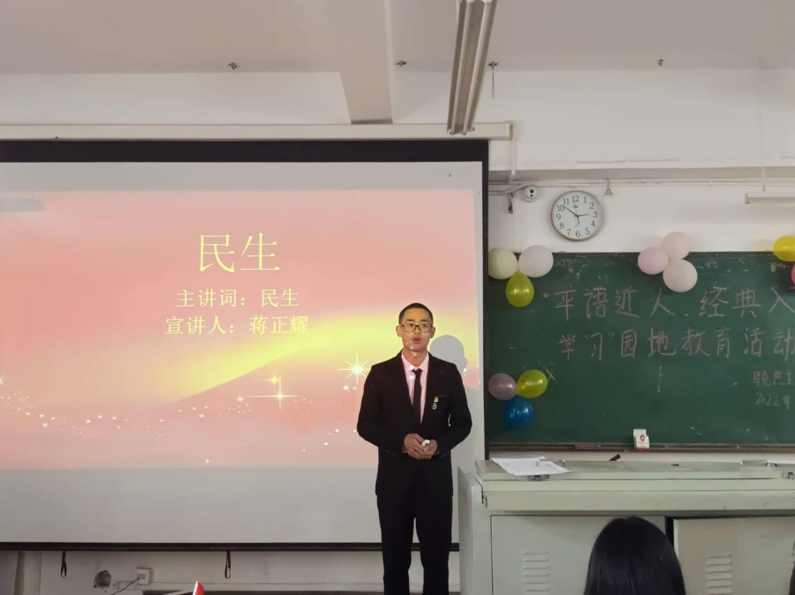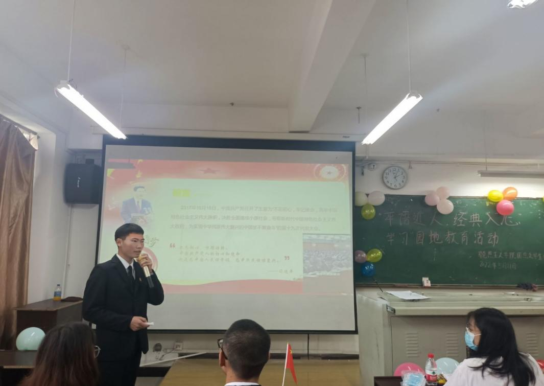 2022年5月22日马克思主义学院团总支举办了“平语近人·经典入心”学“习”园地教育活动,此次活动邀请到了马克思主义学院学生宣讲团成员周亮、张云、蒋正耀三位同学主讲,宣讲人带领我们深入学习习近平总书记蕴含深刻哲理的话语,深入学习习近平新时代中国特色社会主义思想,提高同学们的政治理论水平和专业素养,坚定报国之心,不负韶华,做新时代好青年。
