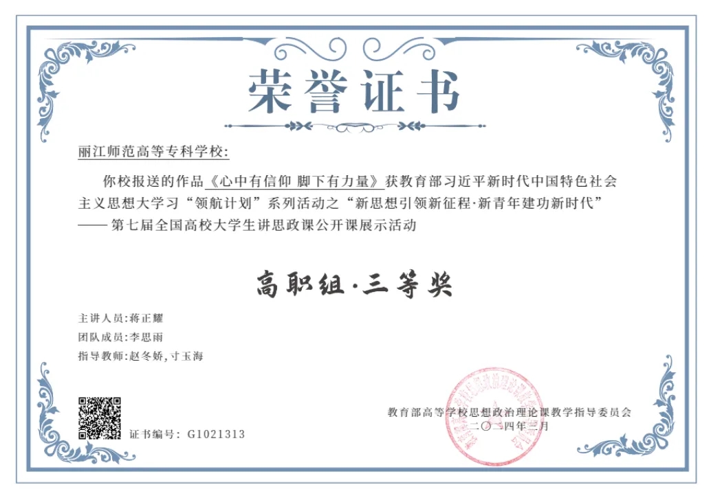 近日,教育部高等学校思想政治理论课教学指导委员会主办的习近平新时代中国特色社会主义思想大学习“领航计划”系列活动之“新思想引领新征程·新青年建功新时代”——第七届全国高校大学生讲思政课公开课展示活动获奖作品名单公布。我校选送的作品《心中有信仰 脚下有力量》荣获高职组·三等奖。