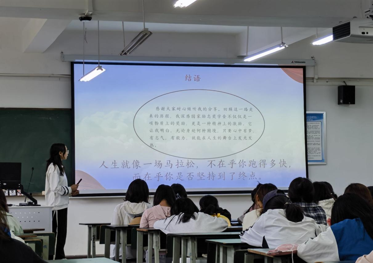 第二位分享者张秀梨同学首先给大家介绍了什么是国家励志奖学金,鼓励同学们在大学里努力学习,争做德智体美劳全面发展的优秀大学生去争取这一奖励。其次,她分享了自己的学习经验,在大学里,我们应明确目标,做好时间规划,提升自己,进而实现自己的学习目标;面对学习的困难时,始终保持一种积极的心态去克服困难;积极参加各种实践活动,以便于我们能够更好的了解社会,锻炼自己的团队协作能力和解决问题的能力,更加坚定自己的学习方向。“人生就像一场马拉松,不在乎你跑的多快,而在乎你是否坚持到了终点”,最后她鼓励同学们无论身处何种困境,只要心中怀有梦想,就能在人生的舞台上发光发亮。
