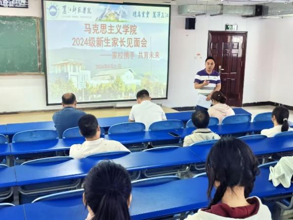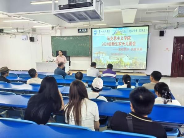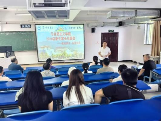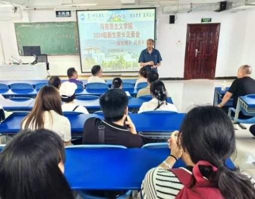 家庭与学校从来都是密不可分的,下午15点的时候我院召开了2024级新生家长见面会,首先由本院的院长寸玉海老师向家长介绍马克思主义学院的基本概况,其次由木金瑛老师讲述了学校教学工作,并强调家校联系要建立在信任的基础上,家长要与老师及时进行沟通,共同助力学生发展。然后由马银行老师讲述了学生的在校规划,同学们在学习的同时也要参与课外活动,促进身心健康发展。
